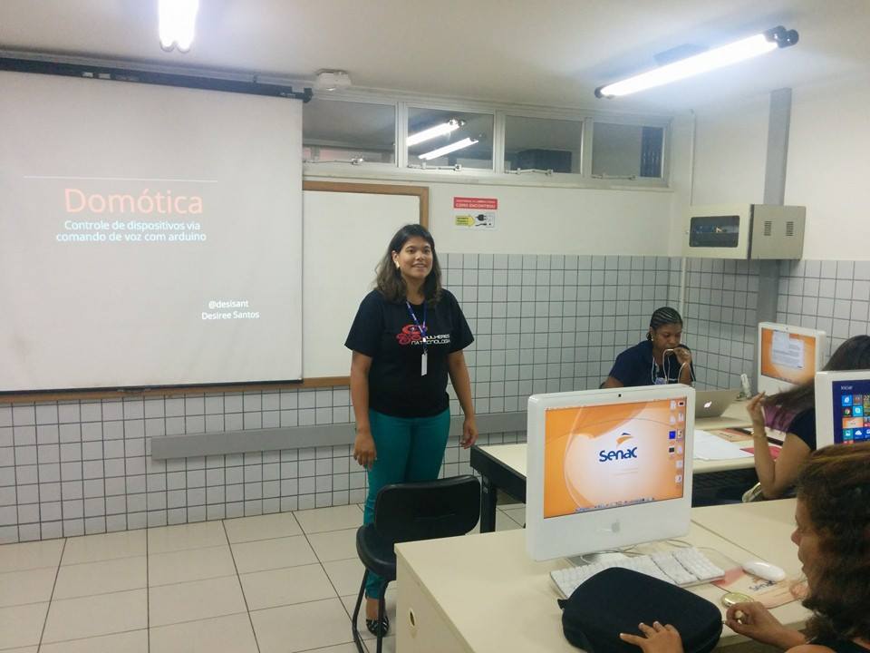 Conhecida de longa data do mulheres na computação, a Desi arrasou! Deu uma palestra sobre Domótica (controle e automação por comandos de voz) incrível que deixou todo mundo vidrado por mais de uma hora…nem lembramos que tínhamos que sair para almoçar! Contou sobre o projeto lindo dela que está disponível em http://github.com/desireesantos/lamp