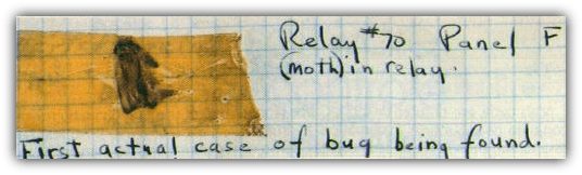 Outro detalhe, mas agora sobre a origem do termo “bug” é que este surgiu quando Grace tentava achar um problema em seu computador. Quando descobriu o problema, ela percebeu que havia um inseto morto no computador. Desde então o termo bug passou a ser usado. E olha o relatório que ela escreveu sobre o ocorrido:
